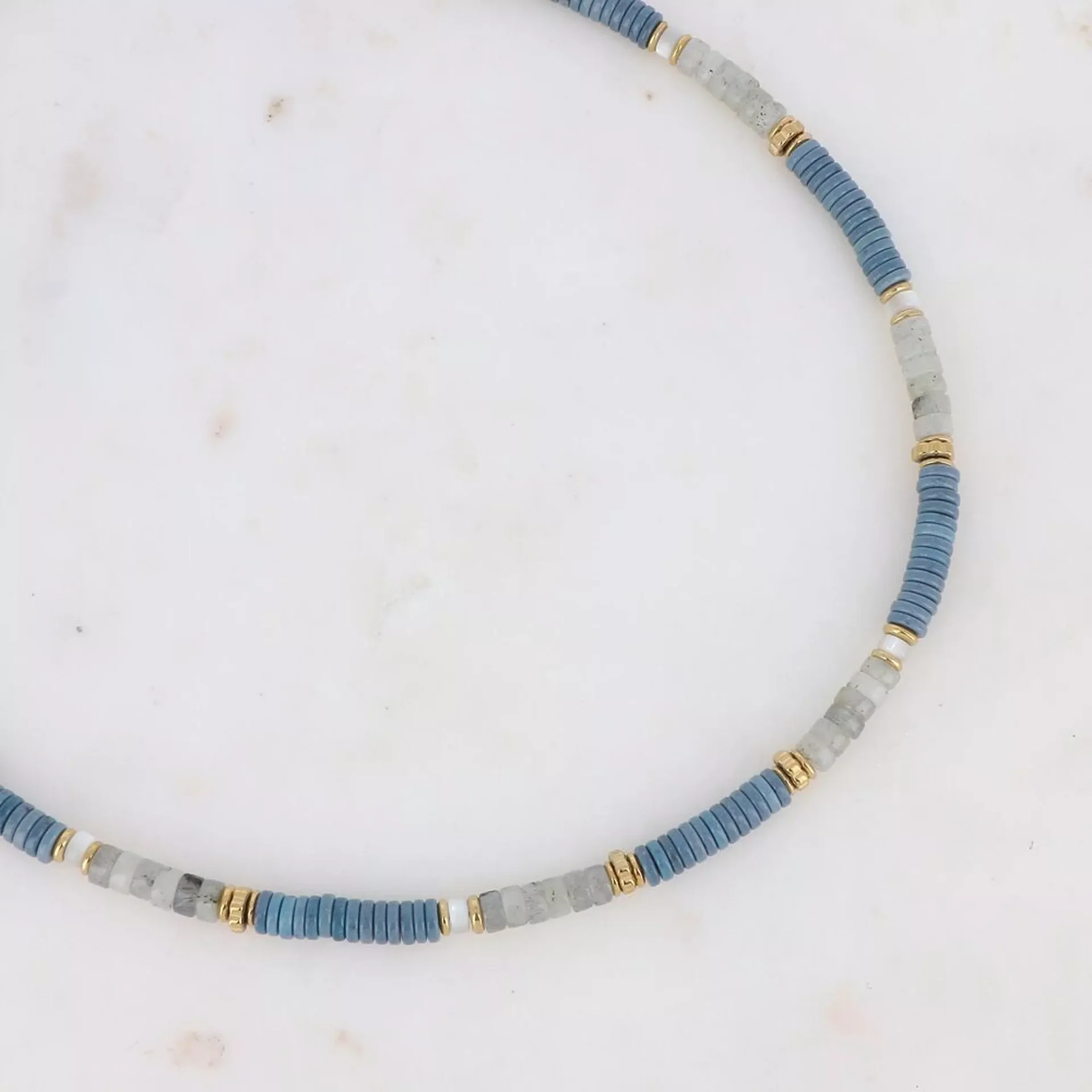Un colier elegant și modern, realizat pe fir metalic și decorat cu pietre naturale de labradorit și sodalit, alături de mărgele din oțel inoxidabil. O combinație subtilă între albastrul profund al sodalitului și irizațiile misterioase ale labradoritului – perfect pentru un look sofisticat cu energie autentică.