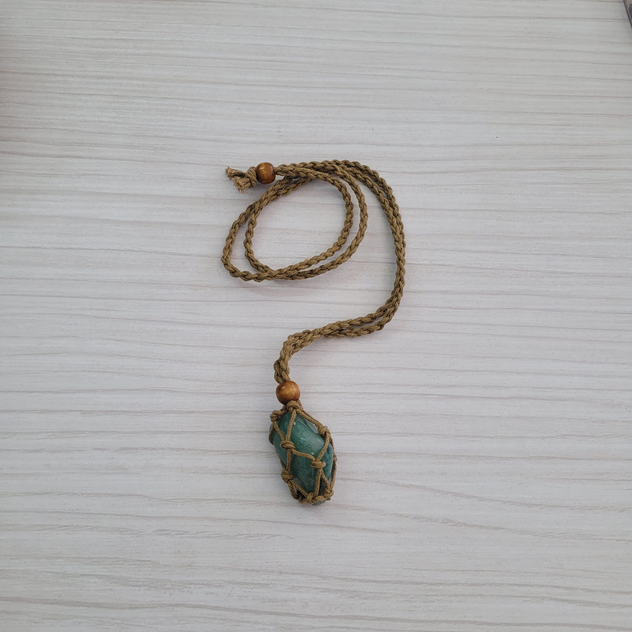 Un mod simplu și natural de a purta cristalele preferate aproape de inimă. Acest șnur de culoarea nisipului este confecționat din bumbac cerat, cu mărgele din lemn decorative și un design tip plasă, perfect pentru a susține pietre semiprețioase de diferite dimensiuni.